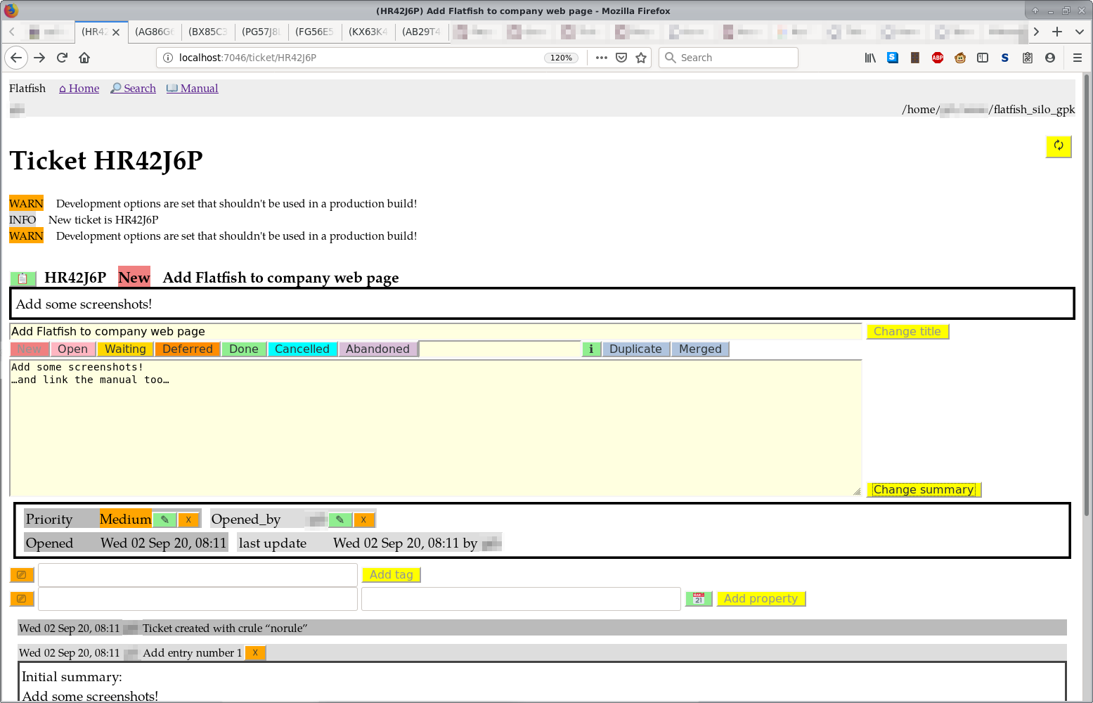 Green Pike uses a custom ticketing system, Flatfish. This is developed using Ada and Dart, and is not open-source. It's currently in development, primarily for our own use.